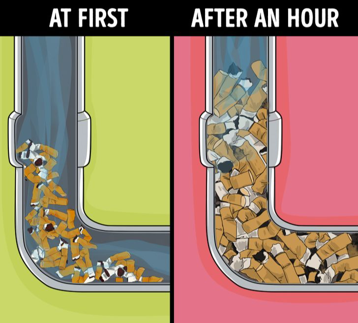 Cigarette filters absorb moisture, swell, and can wedge inside drainage hardware. They degrade slowly and leach residual substances when exposed to water.