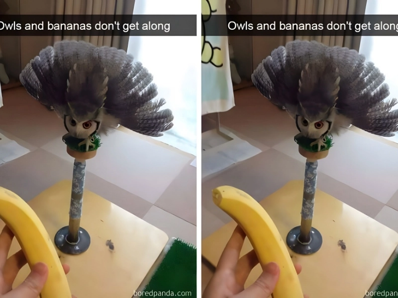 Potential Camera: Sharp Edge+ Where to Purchase: Amazon, Motorola Average Price: $700* Owls are engineered for stealth hunting, yet this comic standoff shows an unexpected foe a harmless piece of fruit. The bird puffs up, doubling its silhouette, deploying the classic bluff display reserved for rivals. A simple household item becomes a perceived intruder. The absurd mismatch underlines how instinct can misfire in a domestic corner. We admire those enormous forward facing eyes built to track faint motion in moonlight now locked onto a yellow curve that lacks any threat. Nature’s ultimate night operative meets snack time slapstick and loses composure just long enough for a perfect frame.