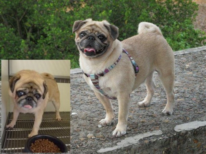 Side by side photos of Patches show the shift from uncertain shelter pug to deeply loved companion, complete with bright expression and improved coat.