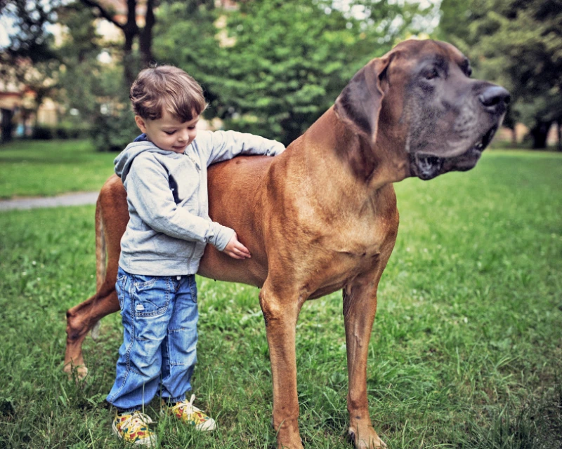 Great Danes are gentle giants with a sweet nature and firm protective instincts. Their massive size deters intruders, and their alertness keeps the home safe. Devoted to family, they are loving companions and reliable guardians.
