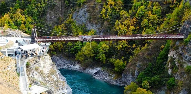 Kawarau Gorge Suspension Bridge in New Zealand is the world’s first commercial bungee site. Built in 1880, it rises 43 meters (141 feet) above the blue Kawarau River and has attracted thrill-seekers since 1988.