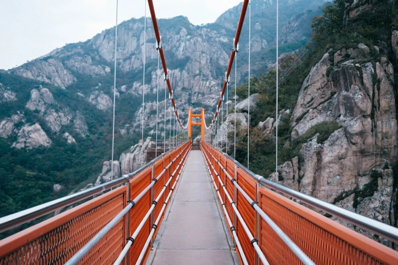 Cloud Bridge in South Korea’s Wolchulsan National Park is one of the country’s steepest and most thrilling bridges. Suspended 120 meters above a deep valley, this 52-meter span is often shrouded in mist, creating a dreamlike setting.