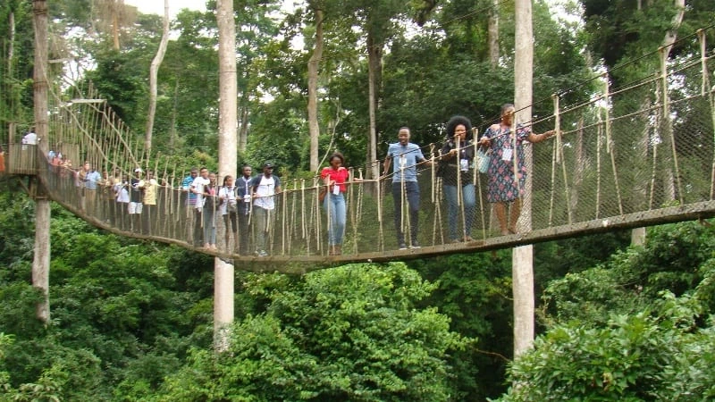 Ghana’s Kakum National Park features the Canopy Walk, a series of suspension bridges 40 meters above the forest floor. Stretching 350 meters, the walkway connects seven trees and offers an ideal vantage to view wildlife.