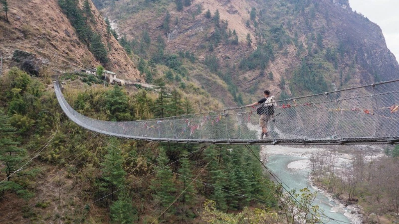 This narrow Nepali suspension span serves people and livestock alike above a steep ravine. The sway of planks under combined hoof and human traffic underscores its essential role in daily regional movement and trade.