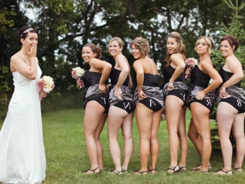 The bridesmaids abandon restraint and radiate gleeful bravado. Their playful boldness reframes the celebration as a stage for personality, not merely etiquette. Confidence and humor eclipse formality.