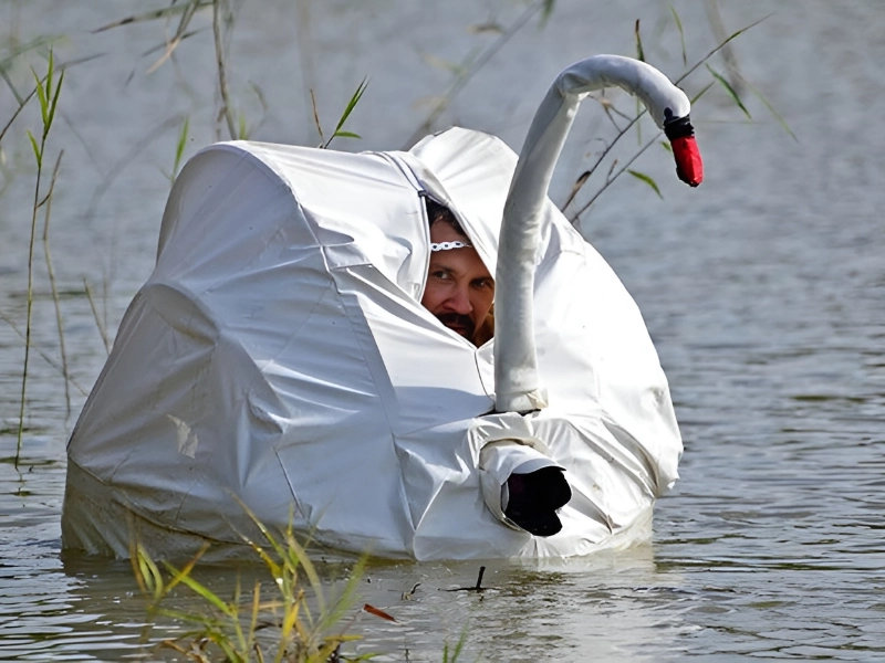 Let us hope the swan does not fall for him. Dressed in white and floating serenely, the subject could be mistaken for one of the elegant birds. This whimsical scene blurs human and animal, mixing gentle humor with poetic beauty.