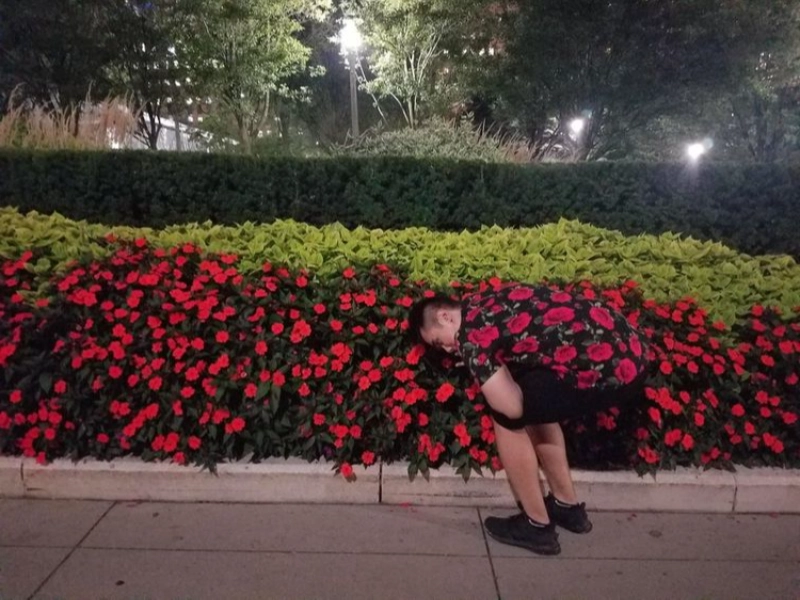 Just missing floral pants. The outfit nearly completes the illusion, but one detail pops, adding a wink of humor. Imperfections can make a moment unforgettable.