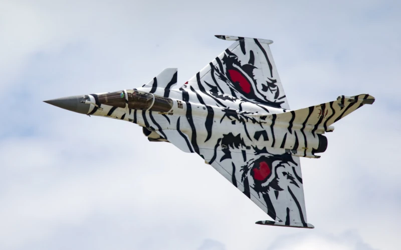 Continuing the tradition, the French Dassault Rafale M wears an Arctic Tiger motif. The sleek jet is enhanced by a striking palette; the white and black base sets off vivid red eyes. Painted for the Tiger Meet, this Rafale M shows how military power and artistic imagination can coexist, making a bold statement in the sky.