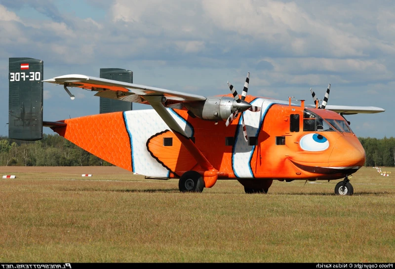 Blending pop culture and aviation, this aircraft brings “Finding Nemo” to life. Operated by Pink Aviation in the Czech Republic, the Short SC-7 Skyvan 3-100 becomes a flying tribute to the famous clownfish. The paint job captures Nemo’s bright stripes and expressive eyes, while “Keep swimming, keep swimming” adds inspiration. This livery proves small planes can deliver big personality.