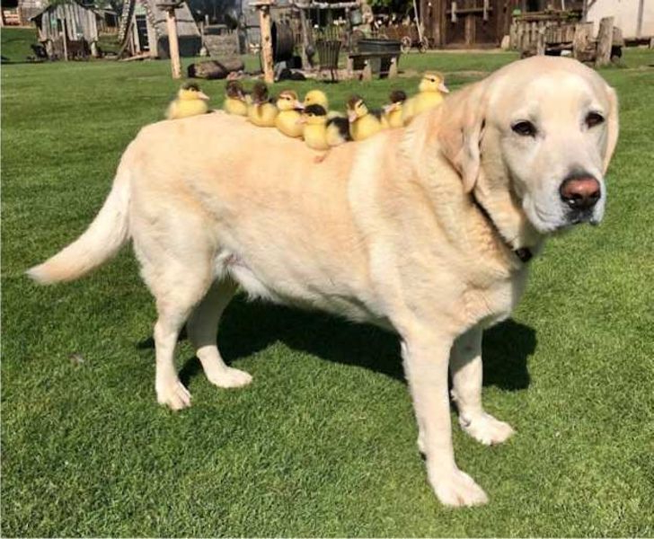 3. When the mother of nine ducklings vanished, this castle dog adopted them.