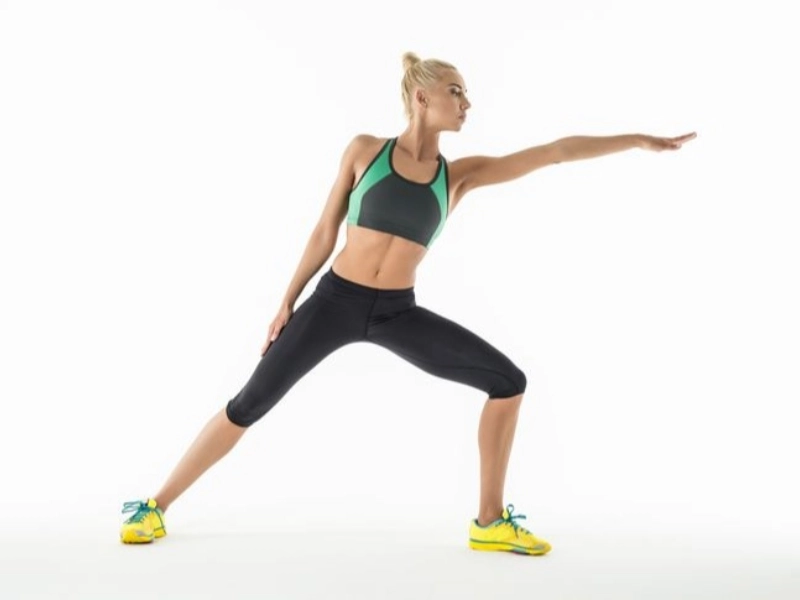 Stand with feet 30 to 35 cm apart and arms at your sides. Pull in your stomach, breathe deeply, and sit back as if into a chair. Lunge right, reaching your right arm to the same side, and slide your left hand down your body. Hold for eight seconds, leaning slightly right. Move only sideways, not forward or back. Repeat 2–3 times on each side. Each session lasts about one minute. Be careful if you have high blood pressure, joint pain, or internal inflammation.