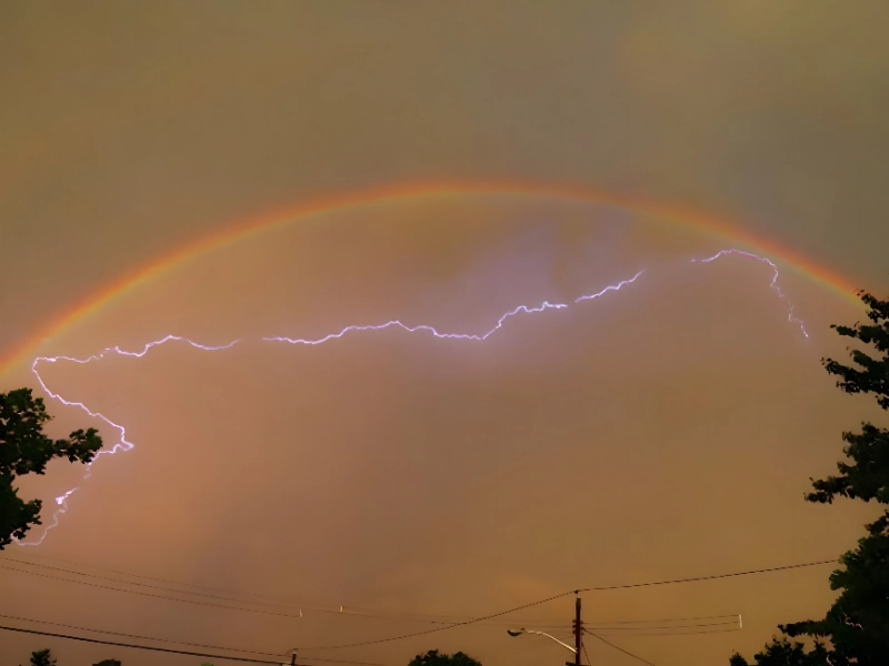 This arresting frame packs three phenomena for careful viewers. A lightning bolt seems to strike near a double rainbow, forging a surreal composite of raw power and delicate refracted light.