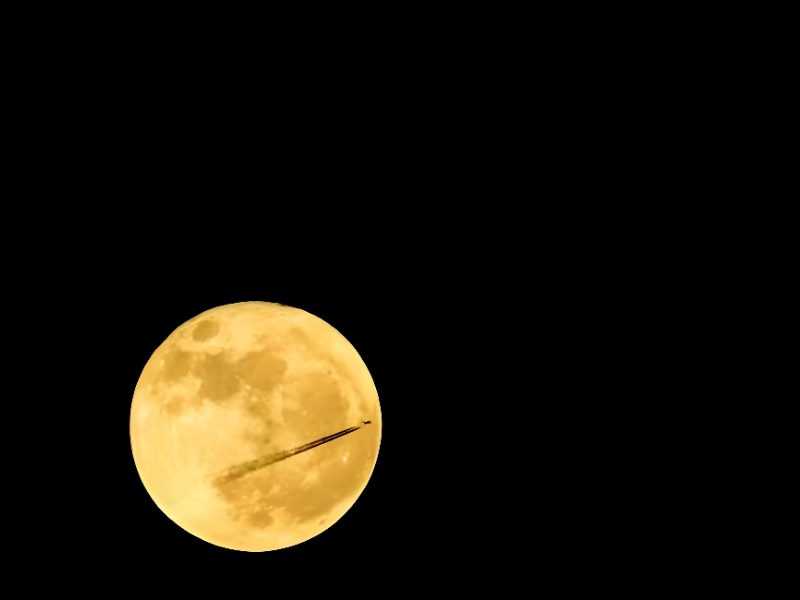 As the moon rules the frame, the fading jet plume accentuates its glow, inviting thoughts of enchanted silhouettes crossing the lunar disc.