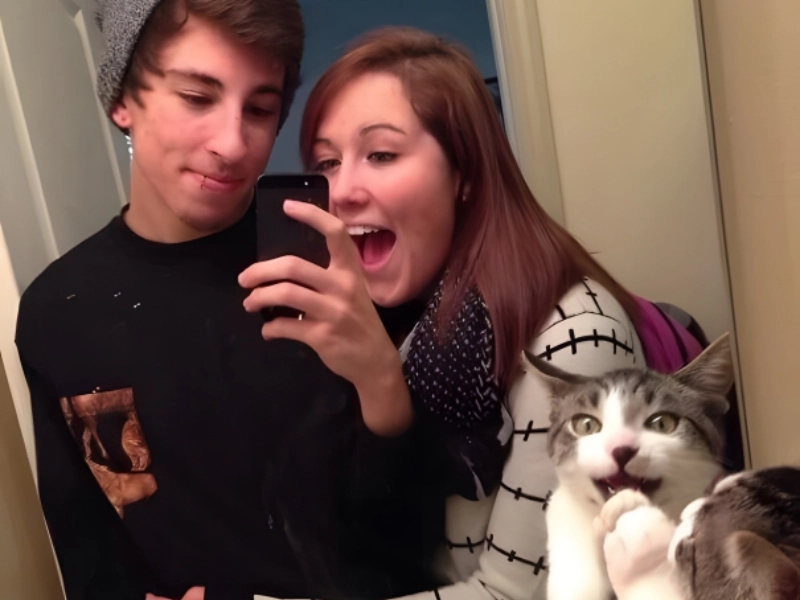 Pets are adorable and this selfie proves it. Cats often mimic owners and join the moment. The couple seeks a sweet shot and their cat copies the pose. Maybe she just wants inclusion or enjoys their together time.