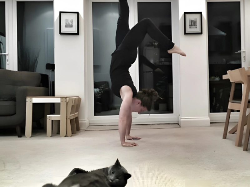 This cat strikes a downward pose while the owner practices yoga. The human might be unintentionally embarrassing the feline, who seems unsure of the routine. Still trying counts. Even a lounge loving cat can progress.
