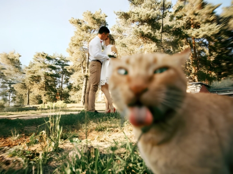 Some couples love camera cuddles, but this cat objects. Perhaps she feels her space invaded. Cats crave focus and will stage comic interruptions to reclaim it. They can flip a perfect portrait into a playful mishap whether it is a family shot, a selfie, or a mock tussle.