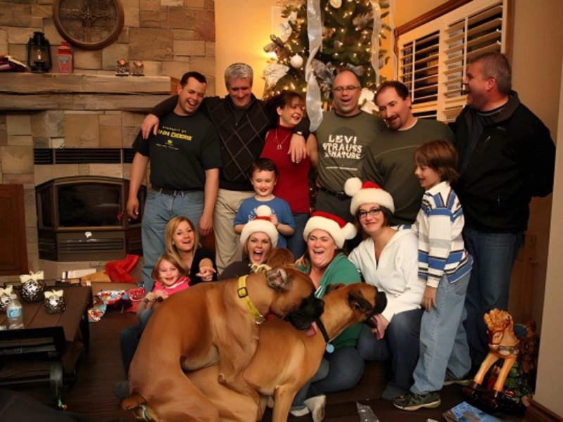 This slightly awkward festive photo shows two dogs who embraced the season a little too enthusiastically. Maybe early presents fueled them. No one intervened—they just kept the cheer going. At least their antics sparked genuine smiles. Sometimes the mood sweeps you along.
