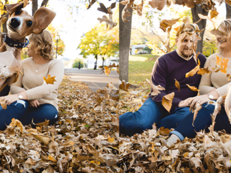 When this couple celebrated their engagement, their little Dachshund hopped into frame with style. He aimed to be star rather than background. Perhaps he was rearranging leaves for artistic flair. Either way he claimed the spotlight.
