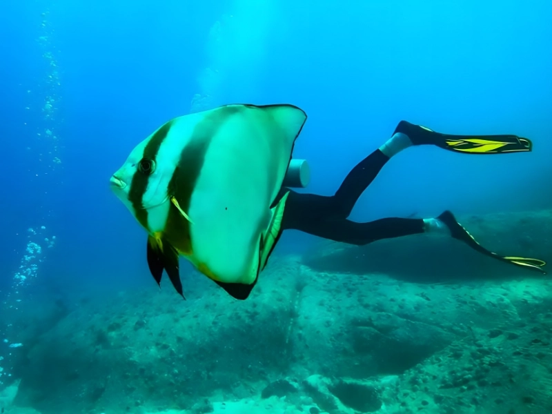 Caught on Camera: A Mermaid Illusion A batfish aligned perfectly before a diver’s body, crafting a fleeting hybrid silhouette. Serendipity turned a routine descent into a storybook moment.