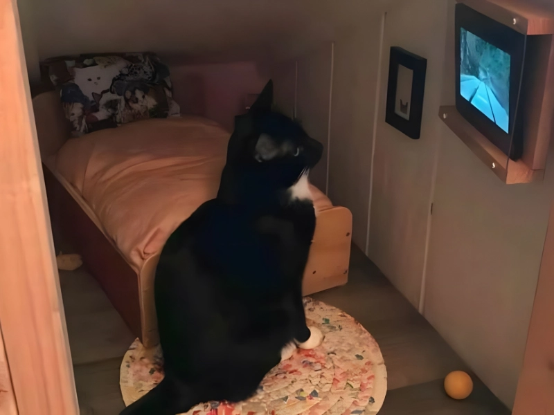 This pampered cat enjoys a custom nook beneath the stairs reminiscent of Harry Potter’s cupboard, yet refined and luxurious. A circular rug, a toy ball, framed art, and a coordinated bed with a cat motif create an indulgent suite. Centerpiece luxury? A personal television.