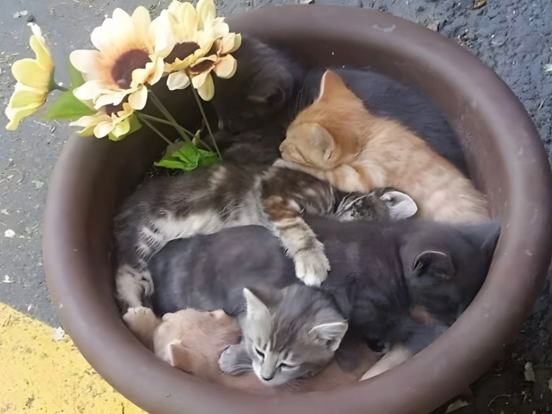The Adorable Cat Pot: Proof of Feline Adaptability This living bouquet of cats showcases effortless communal comfort. The dangling blossoms above add a gentle flourish, turning an already adorable tableau into pure visual joy.