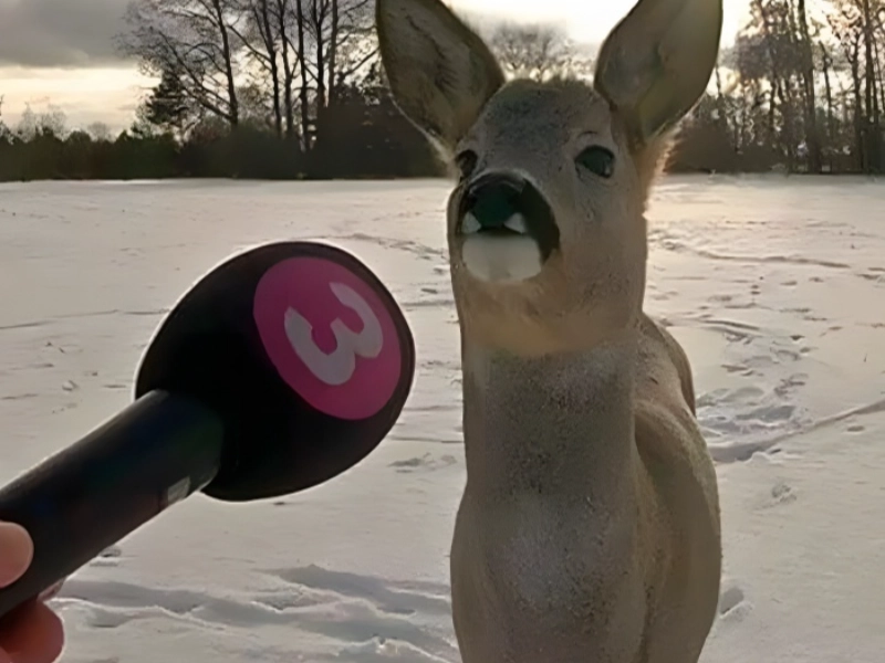 A deer mid interview is not routine. You might assume hunters or nearby shots. A quick search shows a Canadian story about a deer befriending a guard dog. The timing makes local news charming: wide eyed deer, earnest reporter, faux Q and A energy. Knowing it is about unlikely friendship adds warmth. The expression seems to say I did not expect coverage for making a pal. Framing the deer like a spokesperson highlights how context shapes perception—and how its absence can make a scene even more captivating.