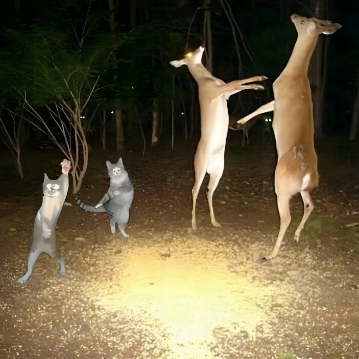 This eerie shot resists easy explanation. Likely a trail cam capturing deer tussling over corn. The glowing eyes and extra animals—possibly cats—create ritual vibes. It almost feels like a secret forest gathering. Study it longer and it resembles a nocturnal club: reflective eyes as strobe lights, deer as headliners, cats as security. Rationally it is shared food at night, but imagining a hidden nightlife makes it far more fun.
