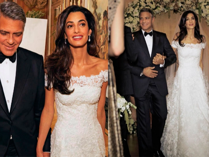 Amal Alamuddin, now Amal Clooney, wore an Oscar de la Renta gown valued near $400,000. Exquisite lace and a graceful shape embodied elevated sophistication and redefined bridal luxury.