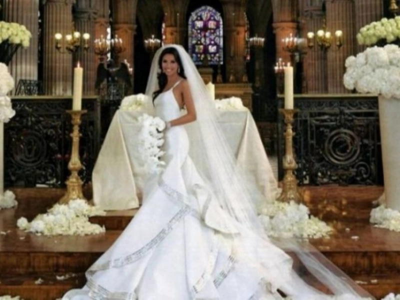 Eva Longoria chose an Angel Sanchez creation in luxe organza and silk. Its fluid lines and meticulous workmanship projected poised elegance. Her selection became a benchmark for brides seeking modern grace with classic depth.