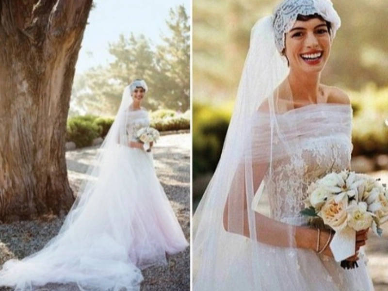 Anne Hathaway selected a Valentino gown radiating soft romance. A pale pink train and lace veil added a dreamlike accent while delicate features showcased her tasteful restraint.
