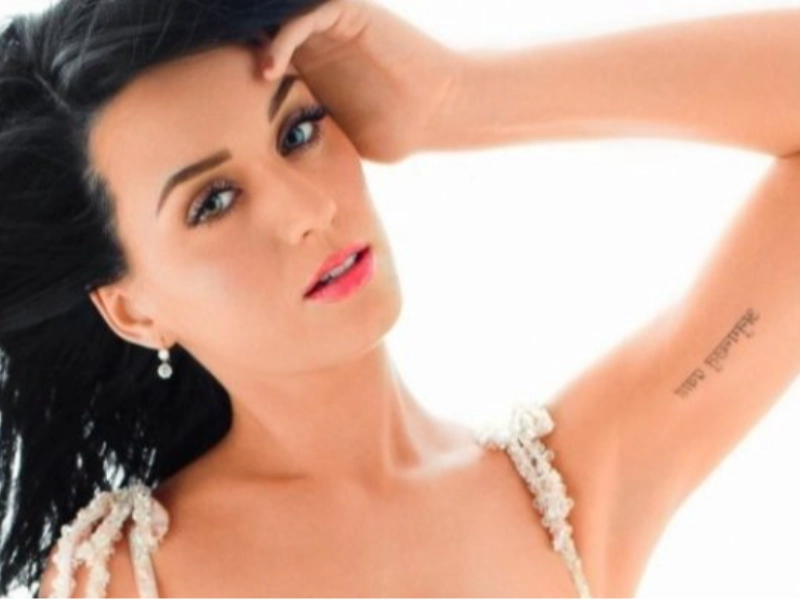 Katy Perry: Playful and Spiritual Ink Katy Perry is known for lively tattoos: a Hello Kitty face on her finger, tiny strawberries and candy on her ankle, and a "Jesus" tattoo reflecting her faith.