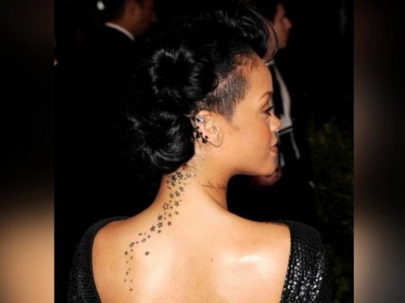 Rihanna's Signature Tattoos: Art and Meaning One of Rihanna's most famous tattoos is a star trail flowing from her neck down her back. It brings elegance and dreamlike energy, symbolizing hopes and ambitions. The stars hint at endless possibilities.
