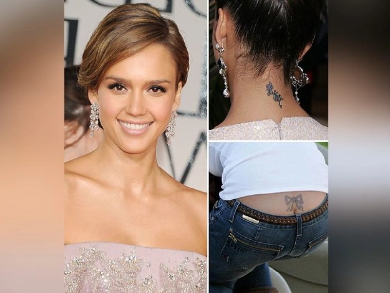 Jessica Alba: Ink with Personal Meaning Jessica Alba is known for tattoos with stories. A bow on her lower back adds elegance, while pieces on her wrist and neck hold special significance.