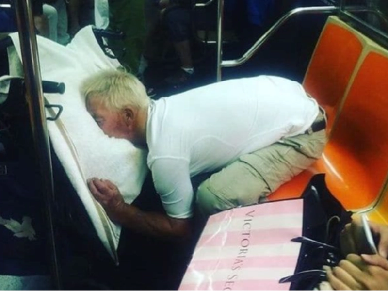 Improvised bed achieved: blanket, posture, surrender. Crafting comfort amid metallic bustle showcases urban adaptability at its quiet peak.