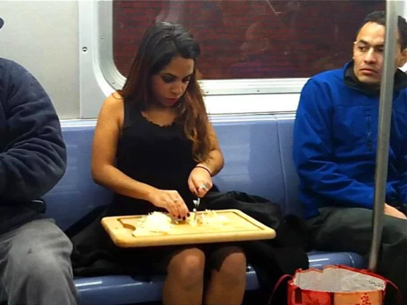 Meal prep in motion: deft hands assemble ingredients as aromas drift. Domestic warmth momentarily displaces sterile transit air, evoking kitchens and shared tables.