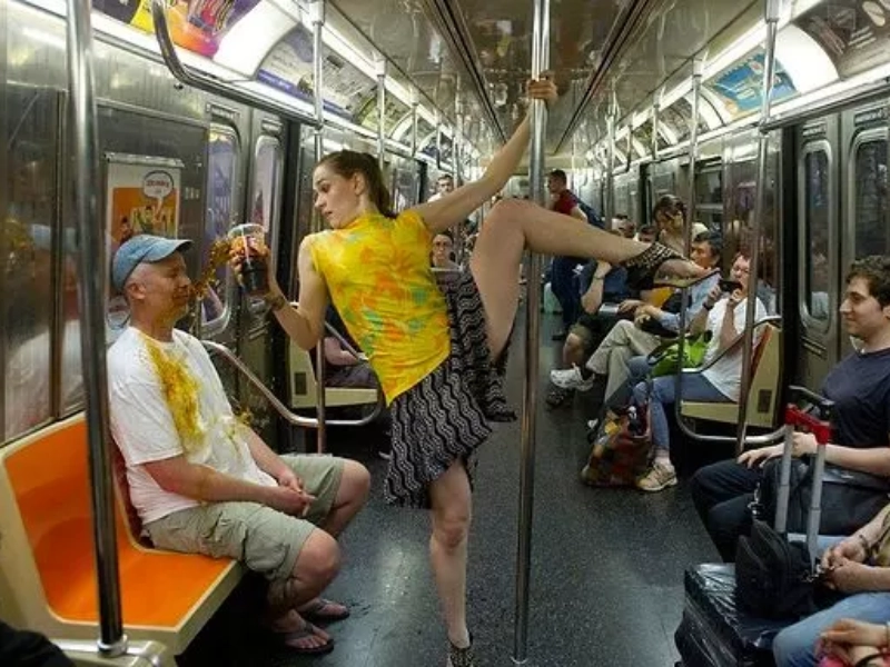 Sudden dance floor: one bold rider spins with infectious zest. Joy erupts mid transit, proving celebration needs only a willing catalyst.
