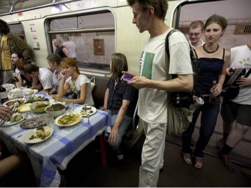 Commute turned banquet: shared snacks, laughter, festive energy. A traveling celebration proves community can bloom in any confined corridor.