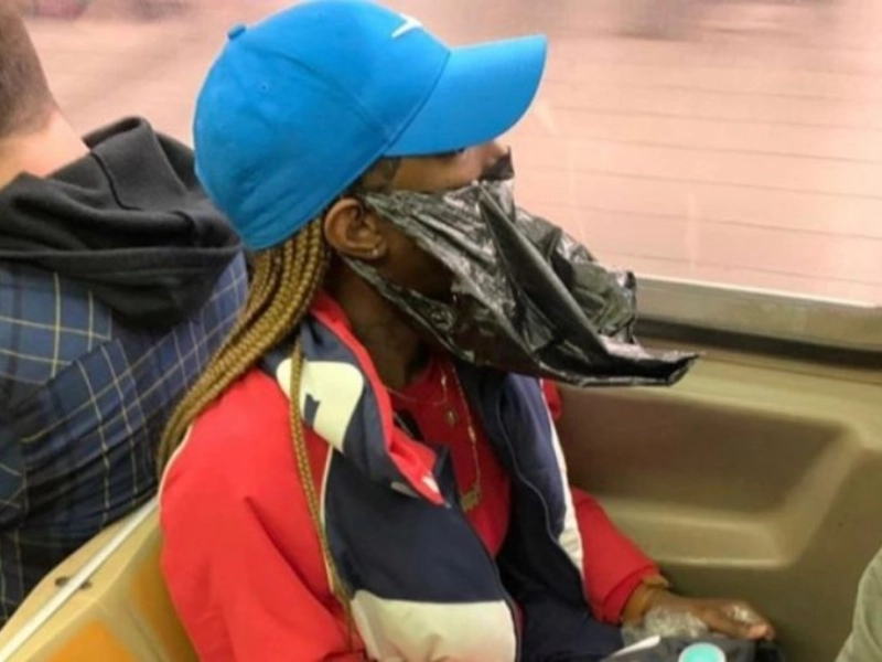 Scarcity sparks invention. Lacking standard masks, this commuter crafts a humorous, functional face covering that shields while eliciting grins. Ingenuity turns tension into a shared, uplifting moment.