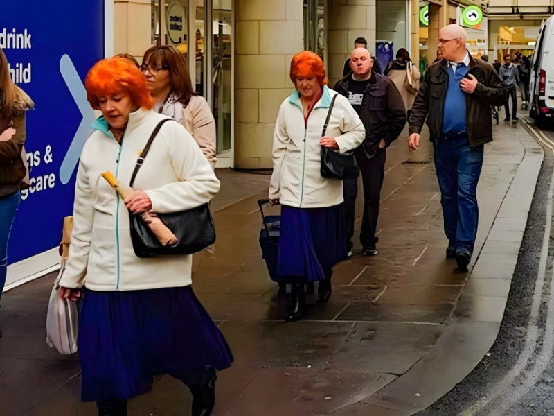 What happened: Two women who look alike Where: United Kingdom. These two women appear to be strangers walking apart, yet they share identical orange hair, the same boots, and matching outfits.